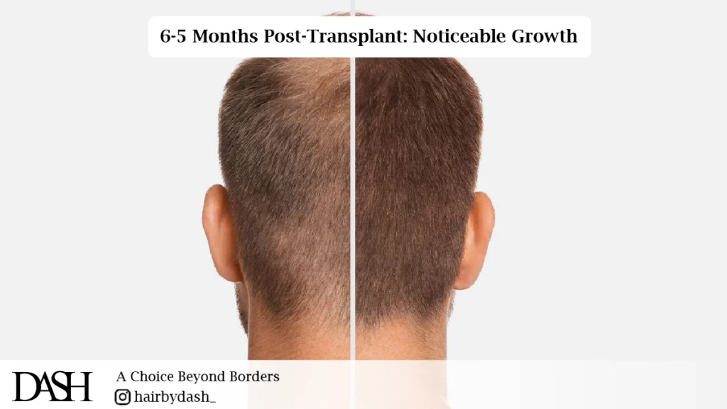 Between 5-6 months post-transplant, hair growth becomes more noticeable as the strands start to thicken and cover more areas. While the final density hasn’t been reached yet, the transplanted hair blends better with natural hair, giving a fuller appearance.